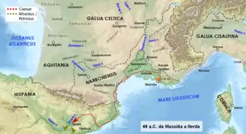 سزار که «از این رفتار موهن به خشم آمده بود» سه لژیون به نزدیکی شهر فرستاد و برج متحرک و وینئاها را بهکار بست تا محاصره شهر را بیاغازد. همزمان در آرل دوازده کشتی جنگی تدارک دید. هنگامیکه این کشتیها در مدّت سی روز تکمیل و مسلح شدند به نزدیکی مارسی فرستاده شده و تحت فرماندهی دکیموس بروتوس قرار گرفتند. سه لژیونی نیز که در خشکی آماده آغاز محاصره بودند تحت هدایت لگاتوسِ وی، گایوس تربونیوس، قرار گرفتند.[97][یادداشت 43] همزمان تصمیم گرفت لگاتوس گایوس فابیوس را با سه لژیون که در ناربون (در نقشه با عنوان Narbo Martius) مستقر بودند را به اسپانیا بفرستد، به وی دستور داد در کوتاهترین زمان ممکن گذرگاههای پیرنه را به اشغال خود درآورد، گذرگاههایی که در تسلط لگاتوسِ پومپیئوس یعنی لوسیوس آفرانیوس بودند. در نهایت دستور داد سه لژیون دیگر که کمی دورتر بودند نیز فابیوس را دنبال کرده و به او برسند. اینچنین بود که فابیوس، چنانکه مأمور شده بود، موفق شد دشمن را از تمامی گذرگاهها بیرون کرده و بهسوی ارتش آفرانیوس پیشروی کند.[98] اندکی بعد، سزار هم بهدنبال گایوس فابیوس در اسپانیا رفت.