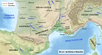 پس از سه روز بحث بینتیجه برای یافتن راهحلی، برای آنکه بیش از این اتلاف وقت نکند تصمیم گرفت روم را ترک کند، و چند روز بعد به گل ناربونی رسید.[93] در ۱۹ آوریل به نزدیکی مارسی (در نقشه با عنوان Massilia) رسید و دانست که لوسیوس ویبولیوس روفوســ که وی را در کورفینیو آزاد کرده بودـ توسط پومپیئوس به اسپانیا فرستاده شده، درحالیکه دومیتیوس انوباربوس با هفت کشتی تندرو از ایتالیا عازم اشغال مارسی بود. در جلوی سپاه انوباربوس جوانان مارسی از خاندانی بااصالت حضور داشتند که به عنوان سفیر به ایتالیا فرستاده شده و پومپیئوســ کمی پیش از عزیمتش از رومــ آنان را تشویق و ترغیب کرده و گفته بود که یادشان نرود چه مزایایی به آنان بخشیده بود.[94]
