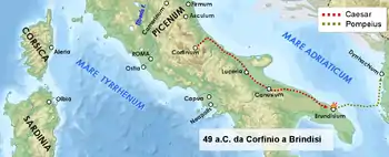 در این میان سزار از اوسیمو حرکت کرد و در سر راه خود تمامی شهرستانها با گرمی وی را پذیرفته و حوایج ارتش وی را از هر حیث تأمین کردند. حتّی از شهر چینگولی (Cingulum) سفیرانی فرا رسیدند که وفاداری خود را به سزار ابراز کردند و برای اطاعت از فرامین وی اظهار آمادگی کردند، از جمله در موضوع تأمین و تدارک سربازانش. هنگامیکه لژیون دوازدهم به سزار ملحق شد، در معیت لژیون سیزدهم بهسوی اسکولی پیچنو (Ausculum) حرکت کردند. این شهر از قبل با ده کوهورس (گردان) از سوی پوبلیوس کورنلیوس لنتولوس اسپینتر[یادداشت 37]اشغال شده بود.[72] اسپینتر هنگامیکه پی برد ارتشی عظیم بهسوی وی در حرکت است تلاش کرد بگریزد امّا نیروهایش وی را رها کردند. وی نیز به نیروی اسکورتی کوچکی تحت هدایت لوسیوس ویبولیوس روفوس که از سوی پومپیئوس فرستاده شده بود تا سربازگیری کند، پناه برد. ویبولیوس موفق شد سیزده کوهورس جمعآوری کند. آنان همگی به دومیتیوس انوباربوس[یادداشت 38] در کورفینیو (Corfinium) ملحق شدند که خود بیست کوهورس دیگر در اختیار داشت و بنابراین در مجموع سیوسه کوهورس (بیش از سه لژیون) در کورفینو منتظر رویارویی با سزار بودند.[73]