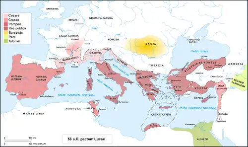 معاهدهٔ تریومویرات در آوریل ۵۶ پیش از میلاد با نشستی دیگر میان سه تریومویر (کراسوس، پومپیئوس و سزار) در لوکا واقع درگالیا کیسالپینا، تجدید شد. در این روزهای بهیادماندنی این شهرستان توسکانی در شمال آرنو «تبدیل به مرکز واقعی جهان شد، [جهانی] که تریومویرها ــ که بار دیگر باهم به توافق رسیده بودند ــ میان خود به اشتراک گذاشتند و در باب سرنوشت آن تصمیمگیری کردند».[19][20][21] پلوتارک یونانی در مورد معاهدهٔ جدید میان این سه میگوید: