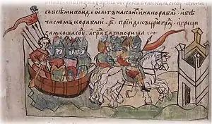 ![]() Oleg leads a squadron of horse-driven boats to the walls of Tsargrad. A medieval Rus' illumination. | |||||||