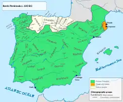 ![]() هیسپانیای باستان در حدود ۱۰۰ قبل از میلاد. نواحی سبز رنگ، کِرِمی و نارنجی بهترتیب تحت تسلط جمهوری روم، اقوام محلی، و دولتشهرهای یونانی هستند | |||||||