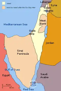 ![]() اسرائیل به رنگ زرد، و مناطقی که در جنگ ششروزه به تصرف اسرائیل درآمده به رنگ کرمی مشخص شدهاست. | |||||||||||