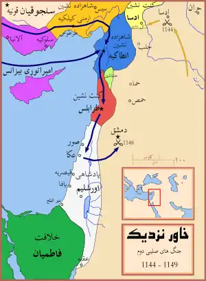 در شرق، وضعیت برای مسیحیان بسیار تاریک بود. در سرزمین مقدس، جنگ صلیبی دوم عواقب طولانیمدت و فاجعهباری برای اورشلیم در پی داشت. اتابک انر در سال ۱۱۴۹ م درگذشت، و امیر ابوسعید مجیرالدین ابق ابن محمد پس از او آغاز به حکمرانی نمود. از آنجایی که مؤیدالدوله بن صوفی، رئیس دمشق و فرماندهٔ شبهنظامیان اَحداث، احساس میکرد گروه احداث نقش عمدهای در شکست جنگجویان صلیبی دوم ایفا کردهاند، خود را لایق سهم بیشتری از قدرت میدانست و دو ماه پس از مرگ انر، شورشی را علیه ابق بهراه انداخت.[160] جنگ داخلی در درون دمشق به پایان دولت بوریان در مدت پنج سال منجر شد.[161] دمشق که دیگر به پادشاهی اورشلیم اعتمادی نداشت، پس از محاصرهٔ کوتاهی بهوسیلهٔ نورالدین زنگی در سال ۱۱۵۴ م گشوده شد.[162]