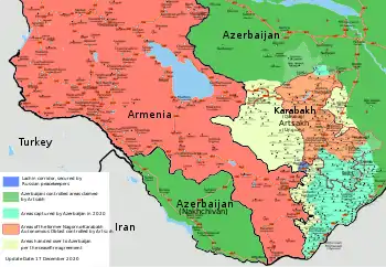اولین دوره جنگ قرهباغ با امضاء قرارداد آتشبس بیشکک در سال ۱۹۹۴، به پایان رسید و قرهباغ کوهستانی و شهرهای اطراف آن، اعم از آغدام، جبرئیل، فضولی، کلبجر، قبادلی، لاچین و زنگلان که قلمرو شناخته شده بینالمللی جمهوری آذربایجان از سوی جامعه بینالمللی است، به تصرف ارمنستان درآمد.[65][69] بنابر گزارش «آکادمی حقوق بینالملل بشردوستانه و حقوق بشر ژنو» در خصوص جنگها که در سال ۲۰۱۸ انتشار یافت، کشور ارمنستان نهتنها با حمایت تسلیحاتی، مالی، آموزش نظامی، و پشتیبانی عملیاتی از «جمهوری خودخوانده قرهباغ» و نیروهای آن، بلکه با مشارکت در هماهنگی و کمک به برنامهریزی کلی فعالیتهای نظامی و شبهنظامی آن «کشور خودخوانده»، در قرهباغ کوهستانی اعمال اقتدار میکند.[70] در طول حدود ۳ دهه به مراتب آتشبس نقض شد، که از شدیدترین نمونههای آنها میتوان به درگیریهای ۲۰۱۶ جمهوری آذربایجان و ارمنستان[71] و درگیری مرزی ارمنستان و جمهوری آذربایجان در ژوئیه سال ۲۰۲۰ اشاره کرد.[72]