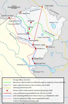 جنگ هند و چین جنگی بود که در سال ۱۹۶۲ بین دو کشور هند و جمهوری خلق چین روی داد. بهانهٔ آغاز جنگ مناقشههای مرزی دربارهٔ منطقهٔ اقصی در هیمالیا بود ولی موارد دیگری در این امر نقش داشتند. پس از اینکه هند در سال ۱۹۵۹ به چهاردهمین دالایی لاما پناهندگی داد درگیریهای مرزی خشونتباری بین دو کشور صورت گرفت. در پاسخ به این درگیریها هند به استراتژیای موسوم به «سیاست رو به جلو»[persian-alpha 1] روی آورد که در آن هند روی مرزش با چین تعدادی برج دیدهبانی ساخت. برخی از این برجهای دیدهبانی شمال خط مکماهون (مرز بین هندوستان و چین است که در سال ۱۹۱۴ با توافق چین، تبت و بریتانیا تعیین شده بود) قرار داشتند. خط مکماهون بخش شرقی خط کنترل واقعی بود که نخستوزیر جمهوری خلق چین چو انلای در ۱۹۵۹ آن را مرز مؤثر کشورهای هند و چین دانسته بود.