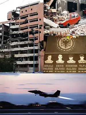 ![]() در جهت ساعت گرد ستاد فرماندهی کل یوگسلاوی توسط بمباران ناتو آسیب دیده - خودرو زاستاوا کورال مدفون شده در زیر آوار در حمله جنگندههای ناتو - مراسم یادبود فرماندهان محلی ارتش آزادیبخش کوزوو - یک جنگنده F-15 نیروی هوایی آمریکا در حال بلند شدن از پایگاه هوایی اویانو | |||||||