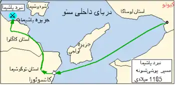 خاندان تایرا پس از شکست در نبرد ایچی نو تانی به نواحی جنوبیتر ژاپن رفتند، پایگاه خود را جزیره یاشیما (در استان کاگاوا کنونی) قرار دادند و کنترل گذرگاهی آبی که به دریای داخلی ستو وصل میشد را در دست گرفتند. خاندان میناموتو تا آن زمان کشتی جنگی تدارک ندیده بودند و توانایی تعقیب خاندان تایرا را نداشتند. یوریتومو برادر کوچکترش یوشیتسونه را مأمور امنیت کیوتو قرار داد و برادر دیگر یوریتومو با نام میناموتو نو نورییوری را برای تصرف منطقه کیوشو به جنوب ژاپن فرستاد. او توانست در ماه فوریه ۱۱۸۵ به کیوشو وارد شود و دازایفو را تصرف کند و منطقه کیوشو را تحت کنترل درآورد. یوریتومو به یوشیتسونه نیز دستور داد به یاشیما لشکر بکشد و خاندان تایرا را از بین ببرد.[70]