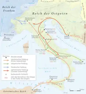 - مشارکتکنندگان ویکیپدیا. «Gothic War (535–554)». در دانشنامهٔ ویکیپدیای انگلیسی، بازبینیشده در ۲۵ ژانویه ۲۰۲۰.