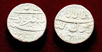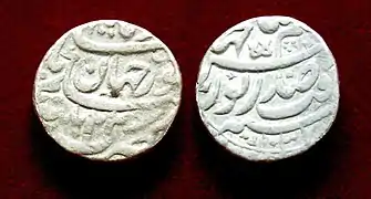 سکه روپیه نقره ای که در زمان جهانگیر نامگذاری شده و دارای نام نور جهان است. مورخ هجری قمری در سال ۱۰۳۷ هجری قمری ، سال ۲۲ عادی (۱۶۲۷/۱۶۲۸ م) ، در پاتنا ذوب شدهاست.