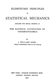 گیبس واژه مکانیک آماری را ابداع کرد و از این کلیدواژه در توصیف ریاضی سیستمهای فیزیکی، شامل پتانسیل شیمیایی (۱۸۷۶)، فیزیک ریاضی (۱۸۷۸) و فضای فاز (۱۹۰۲) استفاده کرد.[41][42] استخراج گیبس از قوانین پدیدارشناختی ترمودینامیک از خواص آماری سیستمهای با ذرات فراوان، در کتابی بسیار تأثیرگذار باعنوان اصول ابتدایی مکانیک آماری مطرح شد، که یکسال پیشاز مرگ وی، درسال۱۹۰۲ منتشرشد.[41]