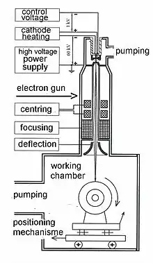 تفنگ الکترونی قلب این فرایند جوشکاری است در تفنگ الکترونی الکترونهای نشر داده شده از کاند که به شکل پرتو درآورده شدهاند، به سمت قطعه کار شتاب داده میشوند. در اینجا از قانون ساده الکتریسیته دفع بارهای همنام از یکدیگر و جذب بارهای غیر همنام توسط یکدیگر استفاده میشود. یک الکترود با شکل کاملاً مشخص فنجانی با بارهای منفی پرتو را شکل میدهد. شتاب دهی به الکترونها توسط میدان الکتریکی ناشی از ولتاژ اعمال شده و به کمک پست الکترود با بار مثبت انجام میشود، پرتو حاصل شده با تمرکز بالا با سرعت ۳۰ تا ۷۰ درصد سرعت نور از سوراخ کوچک میان آند عبور کرده و به قطعه کار میرسد، دفع متقابل الکترونها باعث واگرایی پرتو در طی مسیر خود میشود؛ بنابراین باید این مسئله تحت کنترل باشد تا پرتو در محل از پیش تنظیم شده با قطعه کار برخورد کند و قطر پرتو به هنگام برخورد با قطعه مناسب باشد. در تجهیزات قدیمی تر از خود قطعه کار به عنوان آند شتابدهنده استفاده میشد که چندین عیب داشت جوشکاری در عمقهای از پیش طراحی شده امکانپذیر نبود چرا که لبههای آمادهسازی شده قطعه کار، پرتو را به خود جذب میکرد و کنترل روی فرایند کاهش مییافت. همچنین استفاده از قید و بند در کنار قطعه کار به راحتی امکانپذیر نیست چرا که قید و بندها نیز مانند قطعه کار در معرض اتصال قرار میگرفتند، بنابراین تصمیم گرفته شد که آند شتابدهنده در تفنگ الکترونی قرار گیرد و سیستم تولید پرتو کاملاً از قطعه کار مستقل باشد.