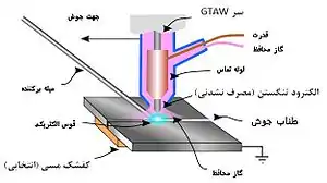 در این فرایند عمل جوشکاری توسط حرارت ناشی از قوس الکتریکی ما بین یک الکترود مصرف نشدنی از جنس تنگستن (یا آلیاژ آن) و قطعه کار صورت میپذیرد. الکترود، قوس الکتریکی و منطقه حوضچه مذاب توسط یک گاز محافظ (آرگون، هلیم، مخلوط هر دو گاز یا مخلوط هر یک از دو گاز با گاز هیدروژن) در برابر اتمسفر محافظت میشود. استفاده از گازهای آرگون و هلیم به علت خاصیت خنثی بودن این گازها میباشد. گازهای خنثی با عناصر دیگر قابلیت واکنش ندارند پس به منظور حذف گازهای فعال مانند اکسیژن و نیتروژن از اطراف قوس و حوضچه مذاب، اکسیدها و نیتریدهای فلزی (Porosity)ایدهآل میباشند بدین ترتیب میتوان از شکل گرفتن تخلخلهای گازی جلوگیری نمود. تخلخلهای گازی، اکسیدها و نیتریدهای فلزی، عیوبی هستند که باعث کاهش خواص مکانیکی جوش از جمله مقامت به ضربه و استحکام کششی میشوند.