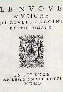 صفحهٔ عنوانِ مجموعهای از آثار او با عنوان موسیقیهای نو (به ایتالیایی: Le nuove musiche)، به تاریخِ ۱۶۰۱