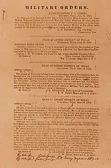 در طول جنگ داخلی آمریکا، رئیسجمهور ابراهیم لینکلن اعلامیه اولیه آزادی را در ۲۲ سپتامبر ۱۸۶۲ صادر کرد.[3] اعلامیه رهایی بهطور رسمی در اول ژانویه ۱۸۶۳ صادر شد.[4][5][6]
