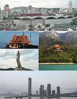 ![]() Clockwise from the top: The Gongbei Port of Entry و Portas do Cerco at the border of Zhuhai and ماکائو، Jintai Temple, Meixi Royal Stone Archways, statue of Fisher Girl, & Deyuefang Restaurant on Yeli Dao. | |
