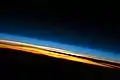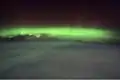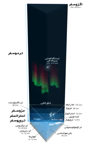 چگالی در ترموسفر بسیار کم است و برخی بر این باورند که فضای بیرونی از بخشهای پایینی ترموسفر آغاز میگردد، اما این لایه بخشی از جو زمین بهشمار میآید. شاتلهای فضایی و ایستگاههای فضایی بینالمللی در این لایه قرار دارند. در بخشهای پایینی این لایه اکسیژن اتمی (O)، نیتروژن اتمی (N) و هلیم (He) اجزای اصلی هوا هستند. بخش عمدهای از پرتو ایکس و فرابنفش در این لایه جذب میشوند. یونوسفر زمین متشکل از ذرات یونیزه شده در جو است و با ترموسفر که از نظر الکتریکی خنثی است، همپوشانی دارد. ذرات باردار یونوسفر با اتمها و مولکولهای ترموسفر برخورد میکنند و انرژی اضافی تولید میکنند. این انرژی اضافی توسط فوتونها[پ 43] بهشکل نور ساطع میشود و شفقهای قطبی را رخ میدهد. شفقهای قطبی عمدتاً در ترموسفر رخ میدهند. ترموپاز[پ 44] مرز میان ترموسفر و اگزوسفر است.[58][59]