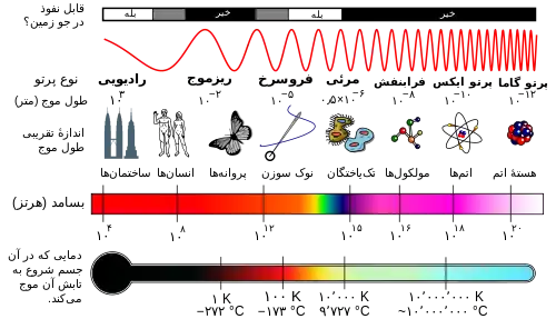 طیف مرئی مخلوطی از رنگها است که دارای طول موج میان ۴۰۰ تا ۷۰۰ نانومتر است و توسط چشم انسان تشخیص داده میشود. اشیاء دارای رنگهای مختلفی هستند، چون هر شیء طول موج خاصی را جذب میکند.[97]
