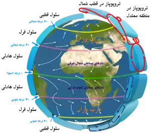گردش جوی موجب توزیع گرما در سطح زمین میشود. سه چرخش پایه در گردش عرضی به نامهای سلول هادلی،[پ 10] سلول فرل[پ 11] و سلول قطبی[پ 12] وجود دارند.