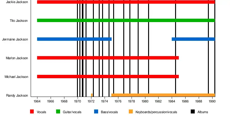 | مایکل جکسون | ۱۹۶۴ – ۱۹۸۴ | خوانندهٔ اصلی و رهبر گروه | در ۲۵ ژوئن ۲۰۰۹ درگذشت |