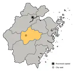 ![]() Clockwise from top: Bridging Tea House in Jinhua Architecture Park، Jinhua Railway Station، Jinhua City 1, Jinhua City 2 | |