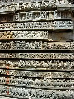 حاشیه زینتی از حیوانات، قسمت اساطیری در پایه معبد Hoysaleswara، هند