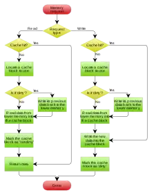 - Write-back (به آن write-behind نیز گفته میشود): در ابتدا، نوشتن تنها در حافظه نهان انجام میشود. نوشتن در فضای پشتیبان به تعویق میافتد تا محتوای اصلاح شده با یک بلوک حافظه نهان دیگر جایگزین شود.