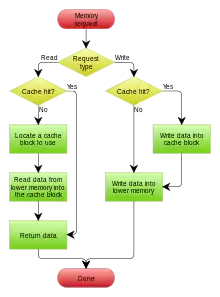 در خواندن از حافظه نهان، یک آیتم داده باید از محلی که در آنجا قرار دارد حداقل یک بار دریافت شده باشد تا در دفعات بعدی که این داده خوانده میشود، افزایش عملکرد به دلیل توانایی بارگیری از حافظه نهان (سریع تر) میانی به جای محل سکونت دادهها تحقق یابد. با استفاده از نوشتن در حافظه نهان، افزایش عملکرد درنوشتن یک آیتم داده را داریم، که ممکن است پس از نوشتن اولین آیتم داده بلافاصله در ذخیرهسازی میانی، تحویل داده شود، و انتقال داده را به محل اقامت آن منتقل میکند و همچنین یک مرحله بعد یا مرحله دیگری به عنوان فرایند پس زمینه رخ میدهد. برخلاف قرار دادن دقیق در بافر، یک فرایند ذخیرهسازی در حافظه نهان باید به یک پروتکل انطباق پنهان (بهطور بالقوه توزیع شده) پایبند باشد تا حفظ یکپارچگی بین حافظه میان مدت حافظه پنهان و محل ذخیرهسازی دادهها برقرار شود. قرار دادن در بافر، از سوی دیگر: