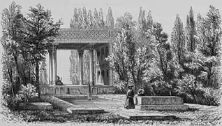 طرحی از آرامگاه حافظ با نمایش چهارستون کریمخانی اثر اوژن فلاندن