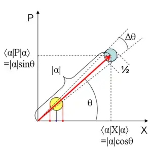 - موقعیت حالت همدوس در صفحه مختلط (فضای باز) در میان مکان و تکانه یک نوسانگر کلاسیکی هم فاز θو هم دامنه (یا هم مقدار با میدان الکتریکی مختلط برای یک موج الکترو مغناطیسی) قرار میگیرد. همانطوریکه در شکل ۵ نشان داده شدهاست. عدم قطعیت، که به طور مساوی در همه جهتها منتشر میشود، به وسیله یک دیسک با قطر ۲٫۱ نمایش داده میشود. از آنجایی که فاز افزایش مییابد و دیسک و مرکز دایرههای حالت همدوس هیچکدام نه پهن میشوند و نه کج. این شبیهترین حالت کوانتومی ای است میتواند یک نقطه منفرد در فضای فاز باشد.