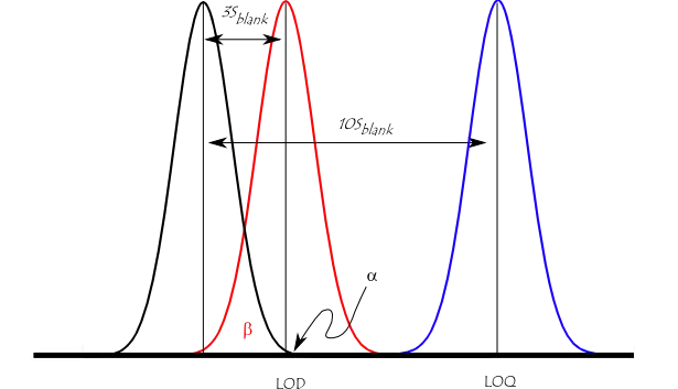اکثر ابزارهای تجزیه حتی وقتی یک بلنک (ماتریس بدون آنالیت) تجزیه و تحلیل میشود، سیگنال ایجاد میکنند. این سیگنال به سطح نویز گفته میشود. IDL غلظت آنالیت است که برای تولید سیگنال بیشتر از سه برابر انحراف استاندارد از سطح نویز مورد نیاز است که ممکن است با استفاده از تجزیه و تحلیل ۸ یا بیشتر از استانداردها در IDL تخمین زده شده و سپس محاسبه انحراف استاندارد از غلظت اندازهگیری شده از آن استانداردها عملی شود. حد تشخیص (مطابق با IUPAC) کمترین غلظت یا مقدار مطلق آنالیت است که سیگنال قابل توجهی بزرگتر از سیگنال ناشی از یک بلنک از معرف دارد. از نظر ریاضی، سیگنال آنالیت در حد تشخیص (Sdl) توسط: .