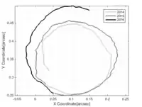 موقعیت قطب لحظهای (تقاطع محور دوران لحظهای زمین با سطح آن) از ابتدای سال ۲۰۱۴ تا نیمه اول سال ۲۰۱۶