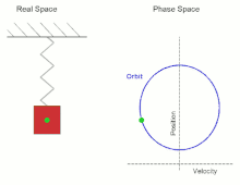 در تصویر متحرک روبه رو یک نوسانگر هماهنگ را میبینید که از یک فنر متصل به جسم ثابت (سقف) و یک جسم متحرک تشکیل شدهاست. اگر جسم را در نقطه تعادلی رها شود حرکتی رخ نمیدهد ولی اگر کمی از حالت تعادلی خارج شود به آن نیرو وارد شده و شروع به نوسان میکند. طبق قانون هوک: که F نیرو و k ضریب سختی است.