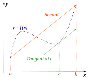 قضیهٔ مقدار میانگین رابطهای میان مقادیر مشتق و مقادیر تابع اصلی را به دست میدهد. اگر f(x) تابعی حقیقی باشد و a و b دو عدد باشند که a < b، قضیهٔ مقدار میانگین بیان میکند که شیب میان دو نقطهٔ (a, f(a)) و (b, f(b)) برابر با شیب خط مماس بر f در نقطهای مانند c میان دو نقطهٔ a و b است. به عبارت دیگر: