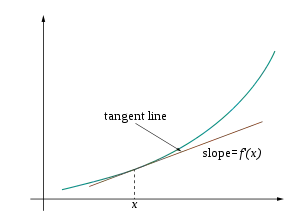 تابعها عموماً خطی نیستند و شیب ثابت ندارند. از نظر هندسی، مشتق f در نقطهٔ x=a شیب خط مماس بر تابع f در نقطهٔ a است که معمولاً به صورت f ′(a) در نمادگذاری لاگرانژی یا dydx|x = a در نمادگذاری لایبنیتزی نمایش داده میشود. از آنجایی که مشتق همان شیب تقریب خطی f در نقطهٔ a است، مشتق بهترین تقریب خطی f در نزدیکی a را به دست میدهد.