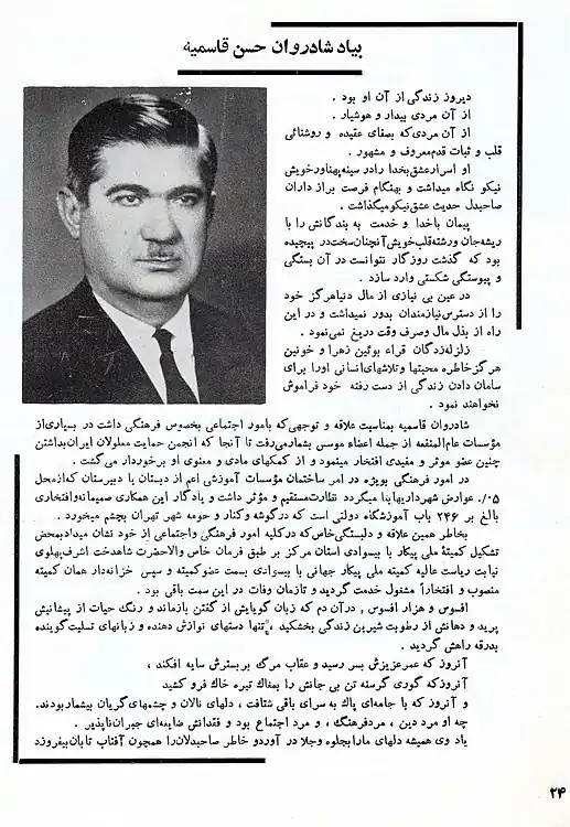 حسن قاسمیه برای فرهنگیان احترام فوق العادی قاٸل بود همیشه سعی بران داشت محیط آموزش و پرورش برای نسل آینده فراهم آورد. در دوران نخست وزیری دکتر محمد مصدق قانونی بتصویب رسید که ۵٪ (پنج در صد) از عواید عوارض شهرداری در اختیار وزارت فرهنگ قرارگیرد. این بودجه برای ساختن مدرسههای دخترانه و پسرانه در نظر گرفته شد وزارت فرهنگ برای اجرای این برنامه مهم دعوت نامهای برای هیݝݖ نظارت که افتخار این امر مهم را جامع عمل بپوشانند فرستاد ازجمله دعوت نامهای به نام حسن قاسمیه فرستاده شد نتیجتاً هیئت مدیره تشکیل شد و آقای حسن قاسمیه عضو افتخاری باعنوان خزانه دار انتخاب شد این سمت را ایشان تا آخر عمر در نهایت علاقمندی و دلسوزی و نظارت تا مدارس از لحاظ کیفیت و کمیت بسیار مناسب باشد. وزارت فرهنگ همه ساله در جشن مهرگان با تقدیرنامه و نیز نشان سپاس از خدمات فرهنگی حسن قاسمیه قدردانی نمود. از رزمند گان مبارزه بابی سوادی بود در دوران خدمت افتخاری او تعدادی بیش از ۲۴۶مدرسه دخترانه و پسرانه در تهران ساخته شد و این کار پس از فوت ایشان نیز ادامه دارد در مدرسه دارالفنون سالن فرهنگی و اجتماعی امیرکبیر را ساخت و در زندان قصر تهران مدرسهای برای زندانیان از همین بودجه به سرپرستی حسن قاسمیه ساخته شد.[6]