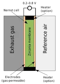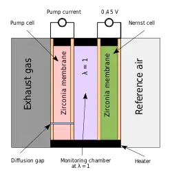 جزء اصلی حسکننده این حسگر قطعهای لولهای شکل از جنس سرامیک زیرکونیا میباشد که توسط لایهای نازک از پلاتین روکش شدهاست. این حسگر بر اساس پیل سوختی الکتروشیمیایی کار میکند و دارای یک طرف مبنا که در مجاورت با هوای اتمسفر قرار دارد و طرف دیگر در مجاورت گازهای اگزوز قرار میگیرد. دو الکترود آن یک ولتاژ متناسب با مقدار نسبت اکسیژن اگزوز به هوای آزاد ارسال میکند. هنگامی که مخلوط سوخت و هوا در حد استکیومتری است ولتاژ مبنا ۴۵۰mV تولید میشود وقتی سوخت رقیق است ولتاژ تا ۲۰۰mV کاهش مییابد. وقتی سوخت غنی است ولتاژ تا ۸۰۰mV افزایش پیدا میکند. ولتاژ تولید شده حسگر غیر خطی است و نکته مهم مقدار ثابت زمانی حسگر برای سرعت پاسخ واحد کنترل الکترونیکی برای تصحیح سوخت است.