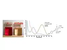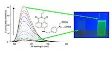 فلوئوفورها و گیرنده همچنین میتواند در حسگر شیمیایی ادغام شوند. این منجر به تغییراتی در طول موج انتشار میشود که اغلب باعث تغییر رنگ میگردد. وقتی که پدیده حسگری باعث تشکیل یک سیگنال میشود، به گونه ای که برای چشم غیر مسلح قابل رویت باشد، به چنین حسگرهایی بهطور معمول رنگ سنج اطلاق میشود. نمونههای زیادی از حسگرهای شیمیایی رنگ سنج برای یونهایی نظیر فلوراید ارائه شدهاست.[38] شاخص pH میتواند به عنوان یک حسگر شیمیایی رنگ سنج برای پروتونها مورد ملاحظه قرار گیرد. چنین حسگرهایی برای دیگر کاتیونها و نیز آنیونها و مولکولهای آلی و زیستی بزرگتر مانند پروتئینها و کربوهیدراتها مطرح شدهاند.[39]