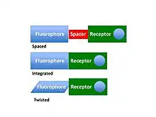 در حسگری شیمیایی امروزه کاربرد فلوروفور متصل به گیرنده از راه فضاگیر کووالانس را گیرنده-فلوروفور-فضاگیر مینامند. در چنین سیستمهایی، رویداد حسگری معمولاً این گونه تعریف میشود که پدیده حسگری ناشی از تغییراتی در ویژگیهای فیزیکی-نوری سیستمهای حسگری شیمیایی در نتیجه کی لیت القایی تقویت شده فلوئورسانس (CHEF)[26][27][28] و مکانیزمهای انتقال الکترون القای نوری (PET)[29][30][31] میباشد. در اصل این دو مکانیسم بر پایه یک ایده واحد استوار هستند و آن این است که مسیر ارتباطی به شکل انتقال الکترون از طریق فضا از گیرندههای سرشار از الکترون به فلئوقورهای دارای کمبود الکترونی (از طریق فضا) میباشد. این منجر به فرونشانی فلورسانس (انتقال الکترون فعال) میشود و در غیاب آنالیتها، انتشار حسگر شیمیایی برای هر دو مکانیزم خاموش میشود. با این حال، پس از تشکیل یک ارتباط پیچیده مهمان-میزبان بین آنالیت و گیرنده، مسیر ارتباطی شکسته میشود و انتشار فلورسانس از فلوروفورها تقویت شده یا «فعال» میشود. به عبارت دیگر، شدت فلورسانس و عملکرد کوانتومی به وسیله شناسایی آنالیت افزایش مییابد.