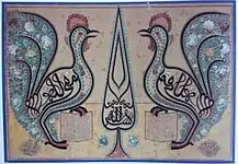- A CALLIGRAPHIC PANEL WITH CONFRONTING COCKERELS, BY MUSHKIN QALAM, PROBABLY AKKA, PALESTINE, DATED 1317 AH/ 1899 AD, The Sotheby's