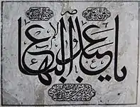عبارت «یا عبدالبهاء» به خط شکسته و اشاره به دعای بهائی «یا بهاء الابهی یا علی الاعلی»