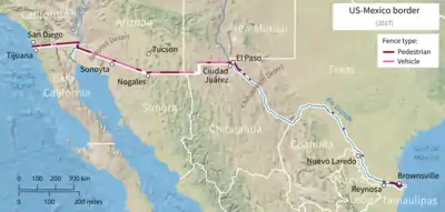 در ژانویه ۲۰۰۹ اداره گمرک و حفاظت مرزی ایالات متحده آمریکا گزارش داده که ۵۸۰ مایل (۹۳۰ کیلومتر) حصار کشیده شدهاست.[3] طول کل مرز بین آمریکا و مکزیک ۱٬۹۸۹ مایل (۳٬۲۰۱ کیلومتر) است.