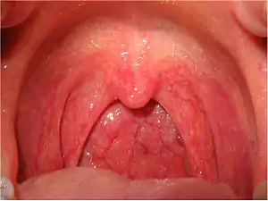 Acute catarrhal pharyngitis. The oropharynx is swollen and red