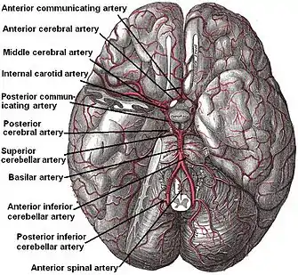| The brain and arteries at base of the brain. Circle of Willis is formed near center. The temporal pole of the cerebrum and a portion of the cerebellar hemisphere have been removed on the right side. Inferior aspect (viewed from below). | |