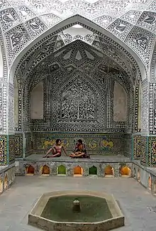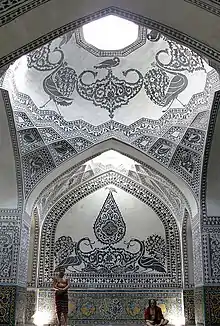 ویژگی بارز دیگر این ساختمان تزئینات پرکار آهکبری با نقش و نگار متنوع و کاشیکاری هفت رنگ با موضوعهای متنوع است. تمام سطح داخلی فضاهای حمام سرد (سربینه) و حمام گرم، خلوتیها و حتی خزینه با نقوش مختلف آهکبری شده است. آهکبریهای این حمام بسیار پرکار است و در آن از نقوش گل و گیاه، هندسی، نقشهای حیوانی و انسانی و ترکیب انسانی و پرندگان استفاده شده است. نقش پرندگان به صورت جفت (نر و ماده) و استفاده در سطح گسترده از نقش شیر و طاووس که طاووسهای آهکبری شده در نوع خود کمنظیر هستند در حمامهای گرم و سرد در دو طرف به طور قرینه استفاده شده که در دو طرف سردر ورودی قرار گرفتهاند. در اضلاع دیگر نیز نقشهای اسلیمی، گل و بته، گل و بلبل در کنار بندیهای سقف گنبدها ترکیب شدهاند. از فرمهای هندسی در حاشیه نقشها و طرحهای اسلیمی استفاده شایانی شده است. در سقف گنبد سربینه از ترکیب چهار طاووس به طرز قابل توجهی بهره برده شده و نقشهای متعدد دیگری که با موضوعهای مختلف ترکیب انسان و پرنده که در دوره قاجاریه مرسوم بود و با شکل و فرم و صورت قاجاری است به صورت متنوع استفاده شده است. کاشیکاری در نقشهای آهکبری زینت بخش حمام سرد است. بر روی تمام پایهها و همچنین ازاره دیوار سکوهای این بخش از کاشیکاری هفت رنگ با طرحهای اسلیمی بر روی پایه و روی دیوارها طرح شکار و نبرد شیر و اژدها کار شده است. هرچند مقداری از کاشیکاری تخریب شده است ولی بخشهای قابل توجهی از آنها باقیمانده است. البته در کاشیکاریها از طرح شکار و نبرد شیر و اژدها، طرحهای گل و برگ و بلبل مرسوم قاجاری و گلهای به سبک و فرم طبیعی به صورت قرینه در قسمتهایی از ازاره دیوار سکو استفاده شده است. به طور کلی کاشیکاری حمام خان در نوع خود قابل توجه و حتی کمنظیر است زیرا نقش کاشیکاری مسجد، مدرسه دارالاحسان، نقوش و طرحهای متفاوتی دارد و در اینجا استادکاران با توجه به وضع فکری و همچنین نیازهای فضای حمام درشیان خان (والی) از طرحهای دیگری استفاده کردهاند.