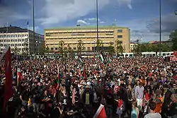 روسیه: جمعی از مردم مسکو در اعتراض به حمله نظامی اسرائیل به کشتیهای حامل کمکهای انساندوستانه به نوار غزه در مقابل سفارت اسرائیل در مسکو تظاهرات کردند. مردم معترض پرچمهای فلسطین، روسیه و ترکیه را در دست داشتند.[35]