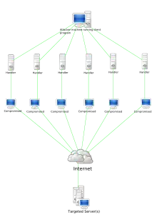 دراین نوع حمله مهاجم به جای استفاده از سیستم خود از سیستم دیگران استفاده میکند. با این کار احتمال شناسایی شدن خود را پایین میآورد، به علاوه موفقیت این حمله به زیاد بودن تعداد سیستمهایی که در این فعالیت شرکت میکنند وابسته است. راههای زیادی وجود دارد که مهاجم میتواند کنترل سیستمهای دیگر را به دست آورد مثلاً ارسال ایمیلهای آلوده به تعداد بسیار زیادی از سیستم ها. به سیستمهای آلوده شده زامبی (zombie) و به شبکهای از این سیستمها که تحت کنترل یک شخص هستند، بات نت (botnet) میگویند. کاربران سیستمهای زامبی اغلب از آلوده شدن کامپیوترهای خود بی خبر میباشند چرا که این سیستم ها برای نابودی سیستمهای دیگر و نه نابودی خود استفاده میشوند.
