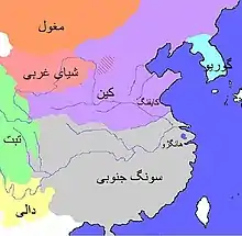 در قرن دوازدهم میلادی، کشور چین بین دو سلسله تقسیم میشد: یکی سلسلهٔ کین (۱۱۱۵–۱۲۳۴) که بر چین شمالی تسلط داشت، و سلسلهٔ دیگر سونگ جنوبی (۱۱۲۷–۱۲۷۹) بود که بر چین جنوبی حکومت میکرد. در سال ۱۲۱۱ میلادی چنگیز خان با تمام قوا به سلسله کین حمله کرد. هدف از این حمله به دست آوردن اسب و مراتع دولتی بود که اسبان نظامی در آن پرورش مییافتند. در آن زمان اسب یکی از مهمترین ابزارهای جنگی به شمار میآمد. سلسله کین پساز از دستدادن تعداد بسیاری از اسبان و مراتع، تضعیف شد. با تسلط مغولان بر پکن، پایتخت چین شمالی که در مرکز کشور قرار داشت، سلسله کین به طرف نواحی جنوبیتر عقبنشینی کرد و پایتخت را شهر کایفنگ قرار داد. جنگ مغول-کین، مابین امپراتوری مغول و سلسلهٔ کین در شمال چین به مدت ۲۳ سال ادامه داشت و عاقبت به سقوط سلسله کین به دست مغول در سال ۱۲۳۴ میلادی انجامید.[16]