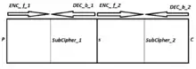 در اینجا ENC تابع رمزگذاری و DEC تابع رمزگشایی است که به صورت ENC -1 تعریف میشود و k1 و k2 کلید ها هستند.