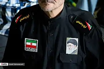پیراهن احمدآبادی با سردوشی «لبیک یا خامنهای» در نماز جمعهٔ ۲۴ فروردین ۱۳۹۷